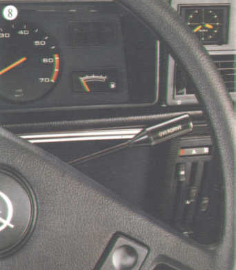 Mit dem Ziehen des Hebels in Richtung Lenkrad wird der Overdrive zugeschaltet, mit Drücken vom Lenkrad weg wieder ausgeschaltet. Das Aufleuchten der Anzeige "OD" im Armaturenbrett zeigt, daß der Overdrive aktiv ist. Mit dem Overdrive sollte bei Überlandfahrt ein Kraftstoff-Einsparpotential von mindestens 1 Liter Kraftstoff auf 100 km erreichbar sein. Nachteilig war, daß die Übersetzung mit 0,778 so lang geriet, daß der Overdrive erst ab einer Geschwindigkeit von 80 km/h genutzt werden konnte und bereits geringe Steigungen oder Überholvorgänge zum Ausschalten zwangen. |