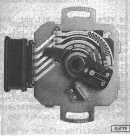 Leerlaufkontakt Bei geschlossener Drosselklappe schließen der mittlere Schleifarm und die am linken Nocken anliegende Angel (Pfeile) den Leerlaufkontakt. Dadurch ist ein Einstellen des Leerlaufgemisches mittels Potentiometer am Steuergerät möglich. Ein geringes Öffnen der Drosselklappe unterbricht den Leerlaufkontakt. |