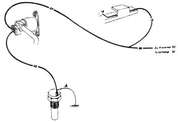 | Ventil am Saugrohr ausbauen, Anschlüsse belassen. Kabel zum Temperaturschalter an Masse legen. Beim Thermozeitschalter nur Kontakt 45 des abgezogenen 2-poligen Steckers an Masse legen (sonst Kurzschlußgefahr). Anlasser betätigen: Kaltstartventil muß abspritzen. Ggf. Kaltstartventil ersetzen. Leitungen ensprechend den Leitungsplänen auf Durchgang prüfen. |