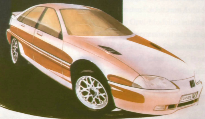 nicht umgesetzt werden. Interessant ist, daß in dieser Studie schon Kühlluft-Auslässe in der Motorhaube zeigt, wie sie in ähnlicher Form beim Kadett E GSi als sportives Element eingesetzt wurden. Etwas später dann in leicht veränderter Form auch beim Lotus-Omega. Bei dieser Design-Studie fallen schon die beim Opel Omega verwirklichten geraden Radläufe hinten im Gegensatz zu den runden Radhausausschnitten vorn auf. Die auffälligen Seitenschweller wurden beim Omega 3000 umgesetzt. Auch die Sicke in den vorderen Kotflügeln und die Form der seitlichen Schutzleisten fanden beim Omega dann den Weg in die Serie. Die Formensprache des Heckspoilers wurde bei den späten Modellen des Opel Manta GSi umgesetzt. |
