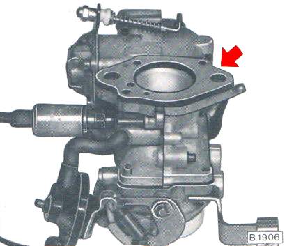 Rückdrehfeder auf der Segmentscheibe an Saugrohr aushängen. Bowdenzug zum Betätigen der Starterklappe vom Vergaser aushängen. Unterdruck- und Kraftstoffleitung nach dem Lösen der Schlauchschellen vom Vergaseranschlußstutzen abziehen. Vergaser abschrauben. |