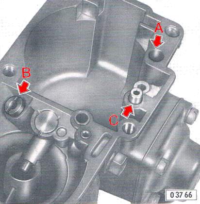 A: Umgemischkanal im Schwimmergehäuse, führt zum Schlauchanschluß Schwimmergehäuse-Drosselklappenteil. B: C: Luftkorrekturdüse "B" herausschrauben. |